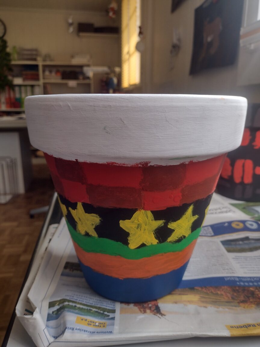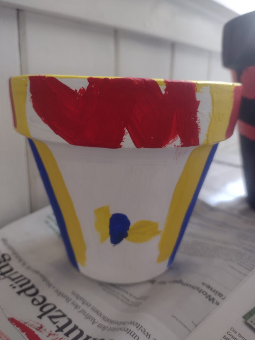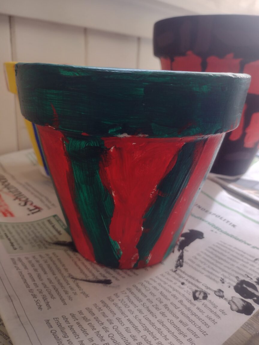 Zuerst wurde eine Skizze für den Topf erstellt. Danach den Topf mit Malerklebi abgeklebt und bemalt.
