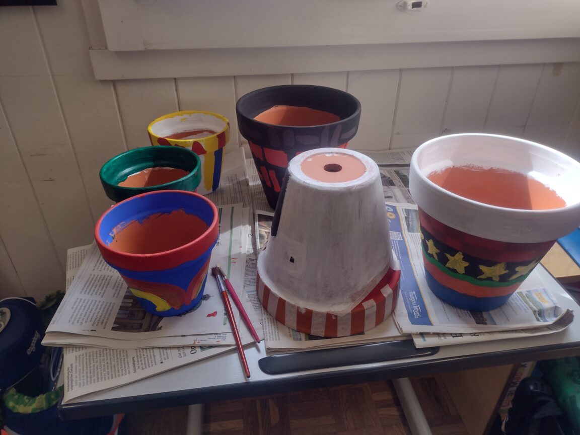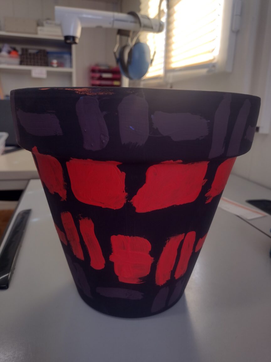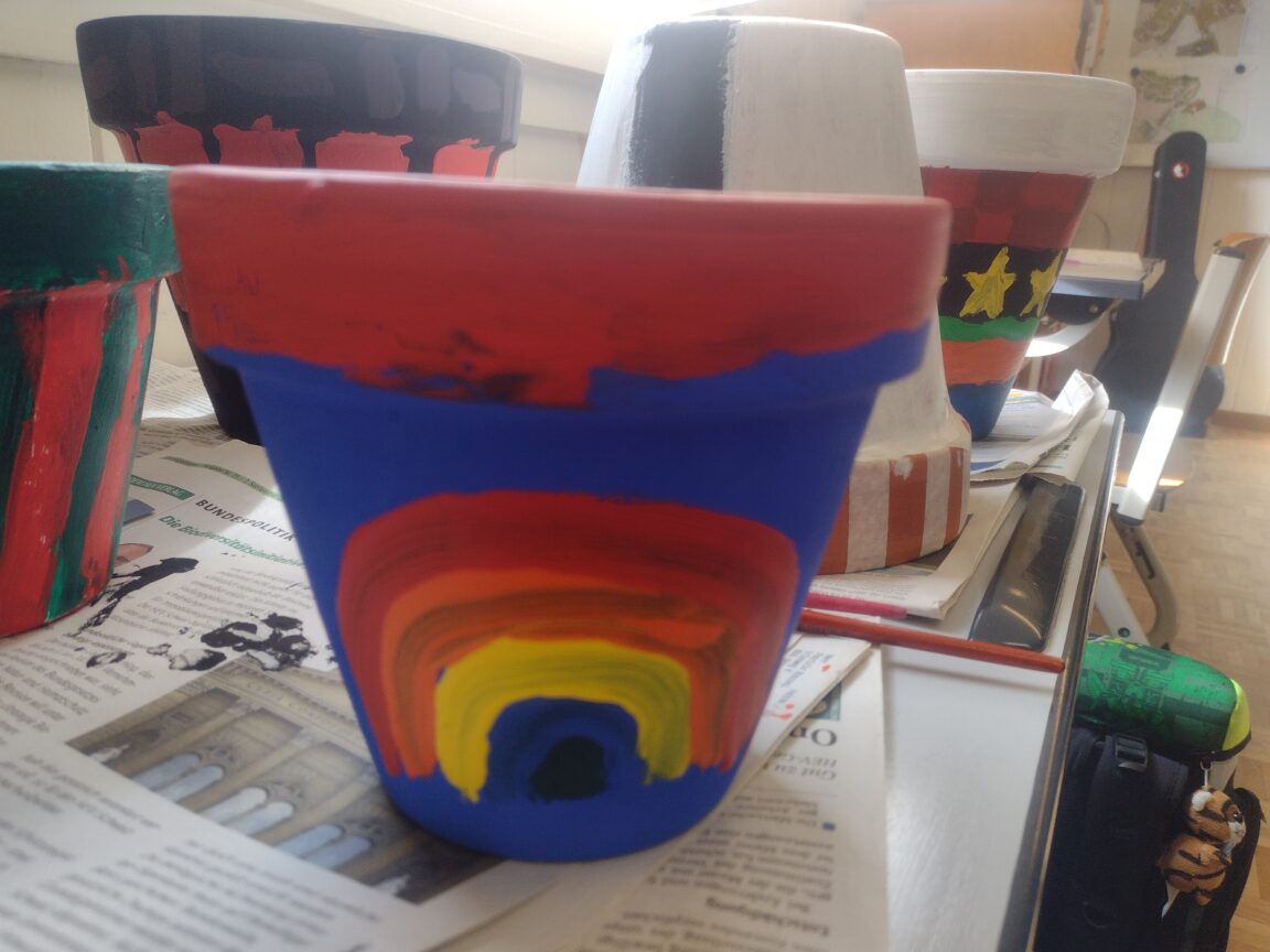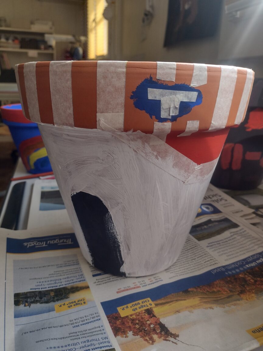 Zuerst wurde eine Skizze für den Topf erstellt. Danach den Topf mit Malerklebi abgeklebt und bemalt.