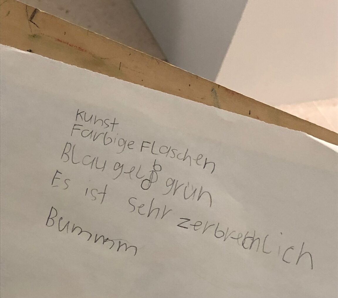 An unserem zweiten Jahresmotto-Tag reisten wir in die Stadt Zug. Am Vormittag besuchten wir einen Workshop im Kunsthaus Zug. Dabei wurden unter anderem gemalte Kunstwerke betrachtet (bspw. von Roman Signer) oder eine bunte Glasflaschenskulpturen von den Kindern mit «Elfchen» beschrieben. Die Mittagspause durften wir freundlicherweise im Foyer Burgbach verbringen (Herzlichen Dank!), bevor am Nachmittag unterschiedlichste Kunstwerke in der Stadt Zug bei einem «Kunstbummel» in kleinen Gruppen entdeckt und bestaunt werden konnten. An wie vielen Kunstwerken sind wir wohl schon so oft vorbeimarschiert, ohne sie als solche aktiv wahrzunehmen? Dies hat sich mit dem heutigen «eigen ART ig – Tag» bestimmt geändert!