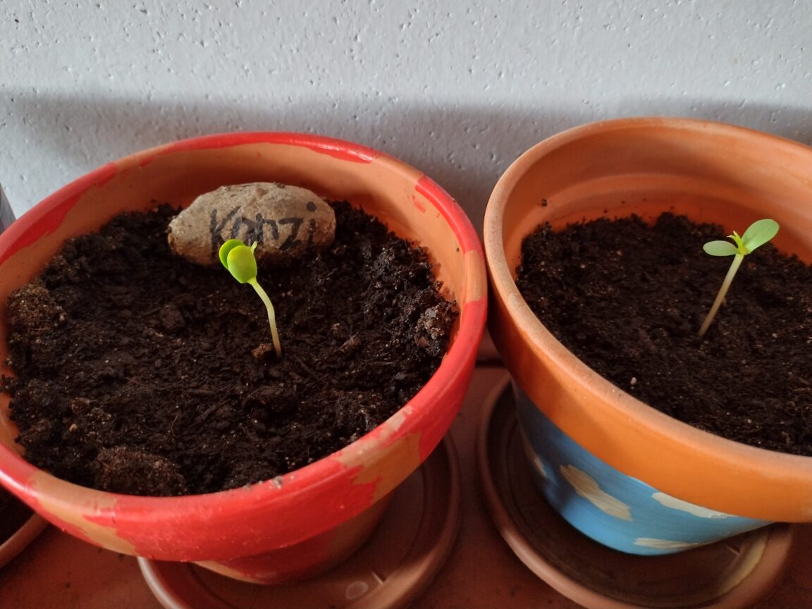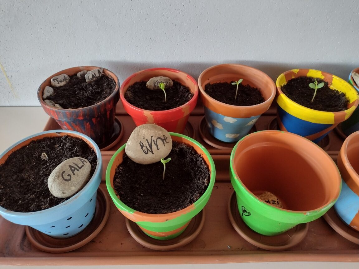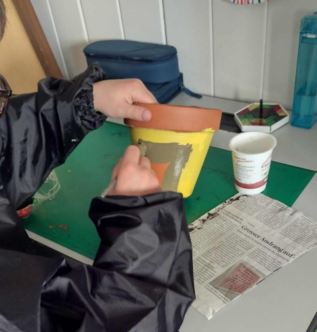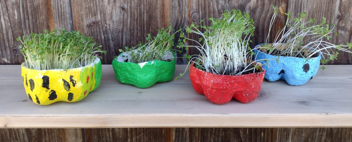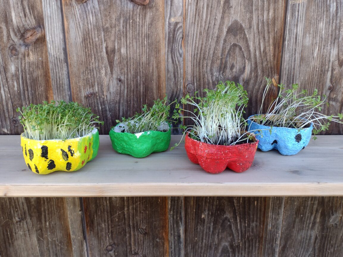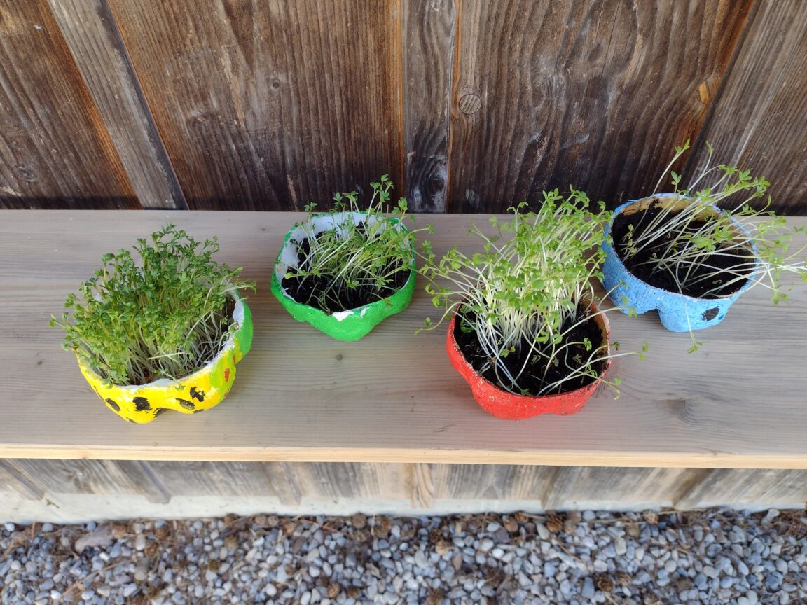 Im Sozialpädagogischen Atelier haben die beiden Kindergruppen zum einen ihre Gips-Fertigkeiten weiter ausgebaut und für Kressesprossen Gips-Pflanzgefässe gestaltet, zum anderen Tontöpfli angemalt und Apfelsamen gepflanzt. Für die Apfelsamen braucht es etwas mehr Geduld, bis Wachstumsfortschritte erkennbar sind – die Kresse hat in grossen Teilen schon den Weg aufs Znünibrot gefunden!