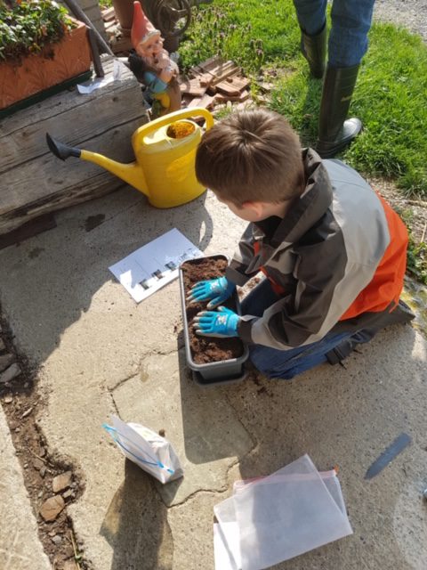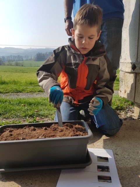 Im Fach Natur, Mensch, Gesellschaft durften die Kinder im Fernunterricht mittels eines kompletten Startersets für ein bepflanztes Balkonkistli selber Hand anlegen. Vielen Dank für die tollen Fotos, die ein Kind mit Eifer beim Pflanzen zeigen!