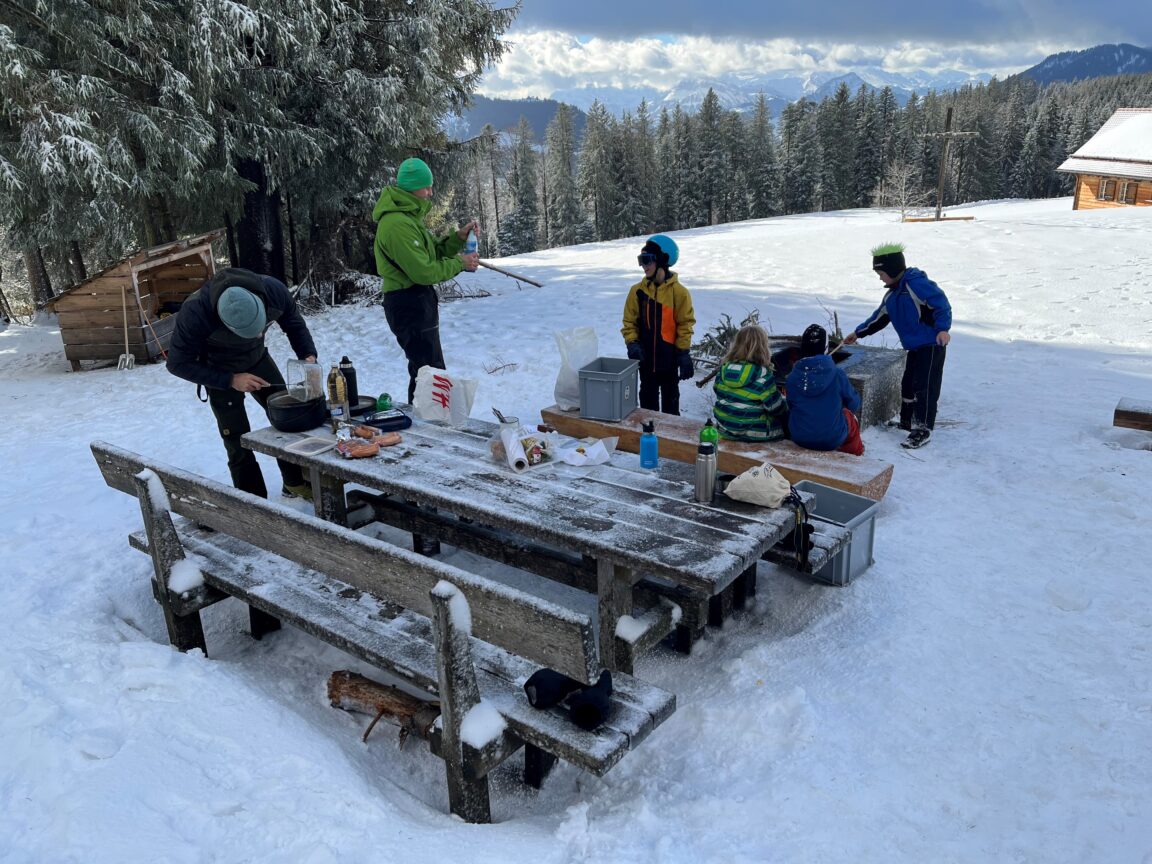 Traditionsgemäss wurden in den ersten drei Tagen der Sportferien die freiwilligen Sportwochenangebote durchgeführt. Am Montag führten sie auf den Raten, St. Jost zum Outdoor-Schneeplausch mit Mittagessen auf dem Feuer zubereitet. Trotz ordentlich Wind hatten wir Glück mit dem Wetter! Weiter boten wir Spiel- und Pizzaplausch in der schuLpLus an und erkundeten am Mittwoch, unter fachlicher Anleitung und Hilfe, die steilen Kletterwände im Kletterpark Root. Ganz schön hoch! Bravo!