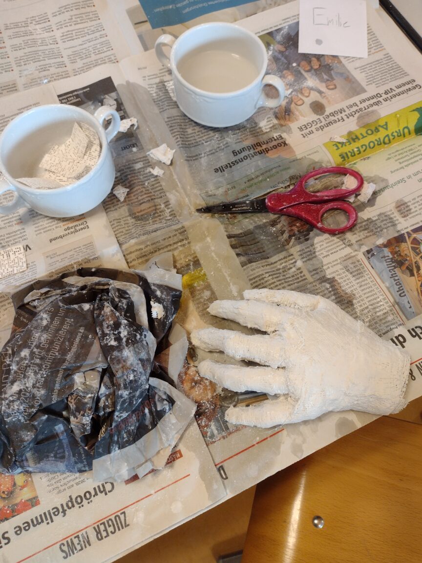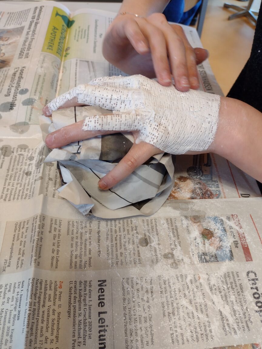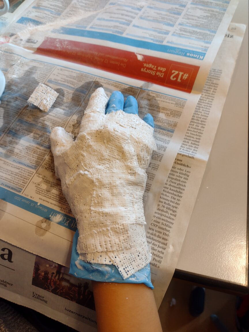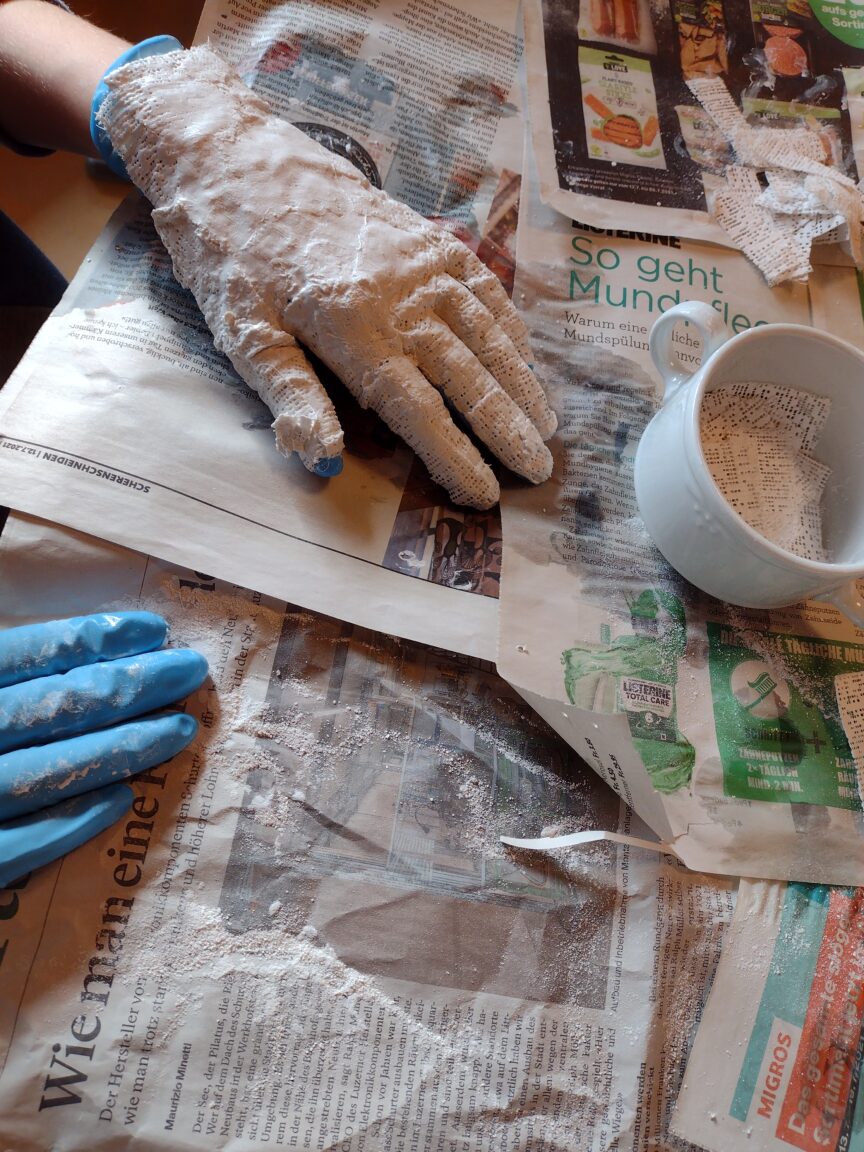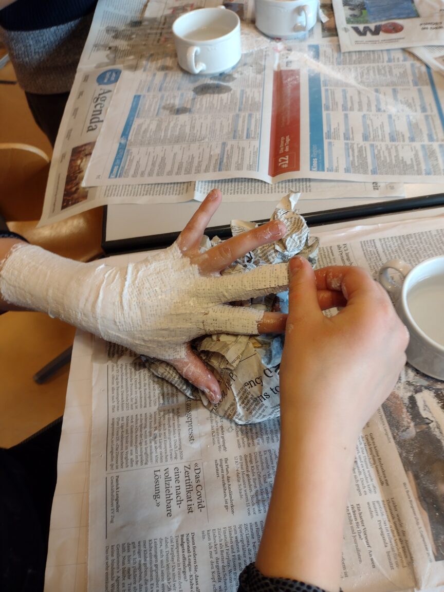 Das sozialpädagogische Atelier wird jeweils parallel zum Schwimmunterricht im Wechsel mit den Unterstufen- oder Mittelstufenkindern angeboten. Aktuell sind unsere «Grossen» dabei, die eigene Hand mit Gips-Mullbinden zu gestalten. Eine Tätigkeit, die die Kinder fasziniert und begeistert.