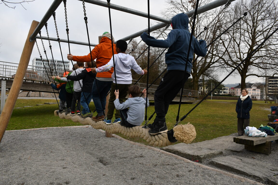 Tag 1 : Fahrt mit den ÖV nach Root in die Kletterhalle. Dort besuchten wir einen Kletterkurs. Wie hoch wir da kletternd kamen- und alle sich dies zutrauten- bravo! Es war sowohl für die Kinder wie auch für Erwachsenen eine spannende Herausforderung. Nach dem Klettern gab es ein feines Picknick. Danach fuhren wir mit dem Zug zurück und besuchten unterwegs einen Spielplatz am Zugersee.