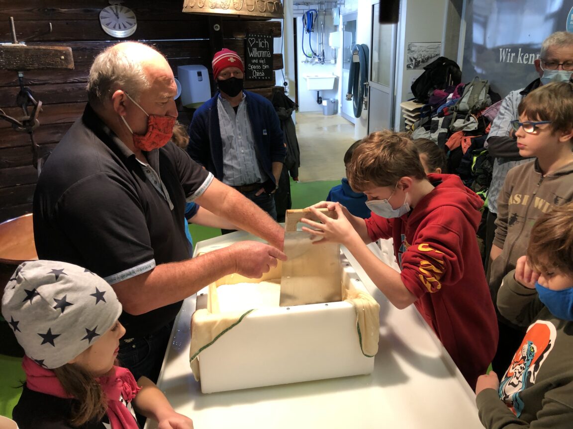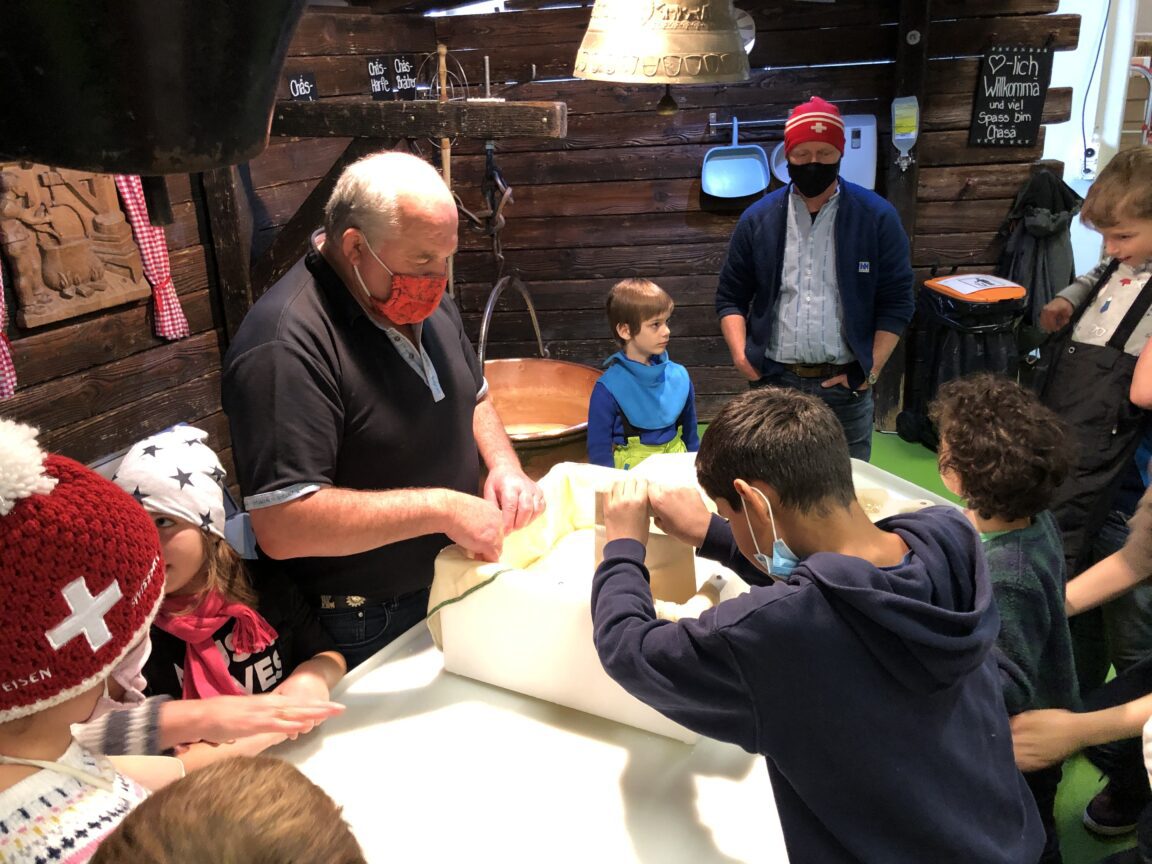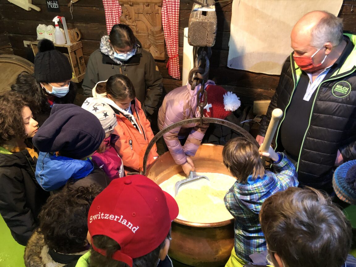 Unser 3. typisCH-Tag führte uns am Morgen zur Milchmanufaktur Einsiedeln. Unter fachkundiger Anleitung stellen die Kinder ein Sennenmutschli-Käse her. Der Käse-Herstellungs-Vorgang wurde vorab im Unterricht behandelt, so konnten sich die Kinder ganz auf’s praktische Handwerk «käsen» konzentrieren. Im Januar wird sich herausstellen, ob aus dem selber gemachten Käse ein genussvoller Happen geworden ist – wir sind gespannt!