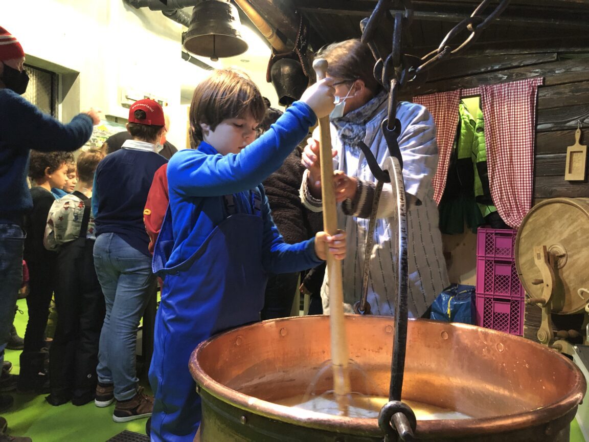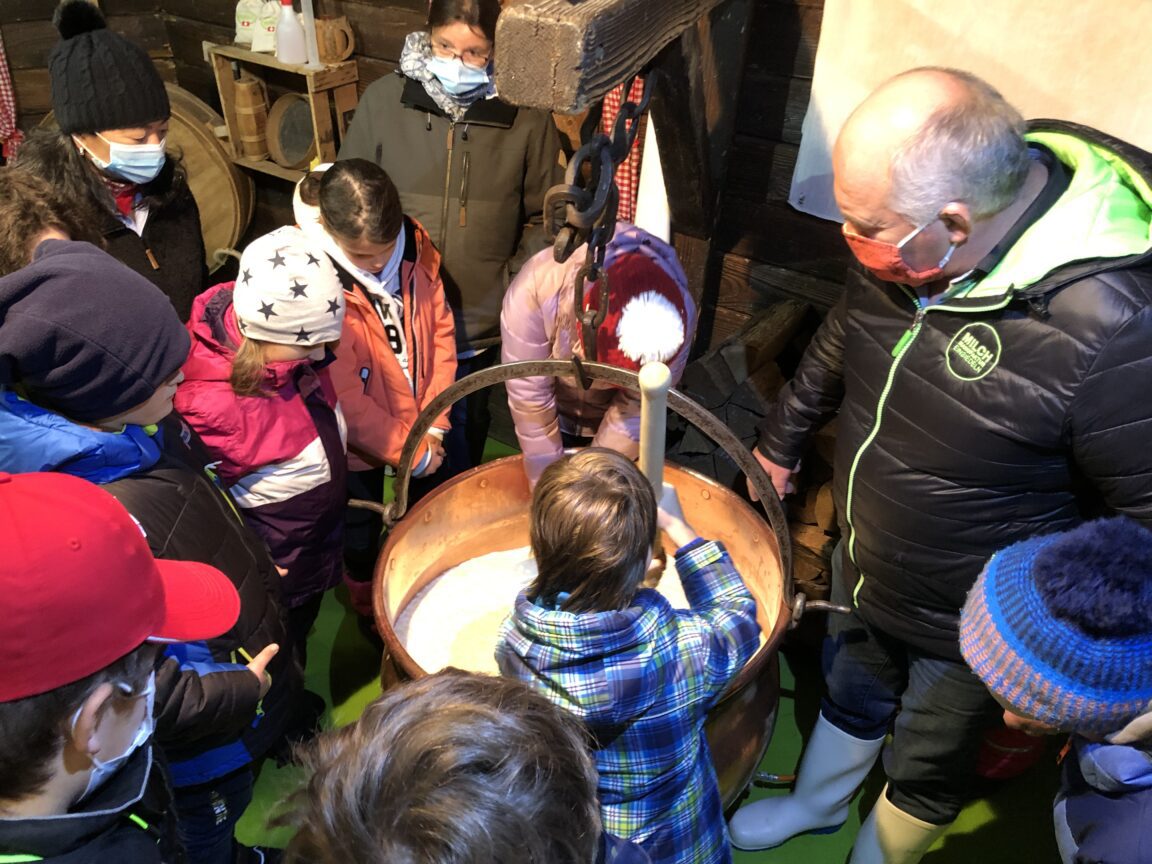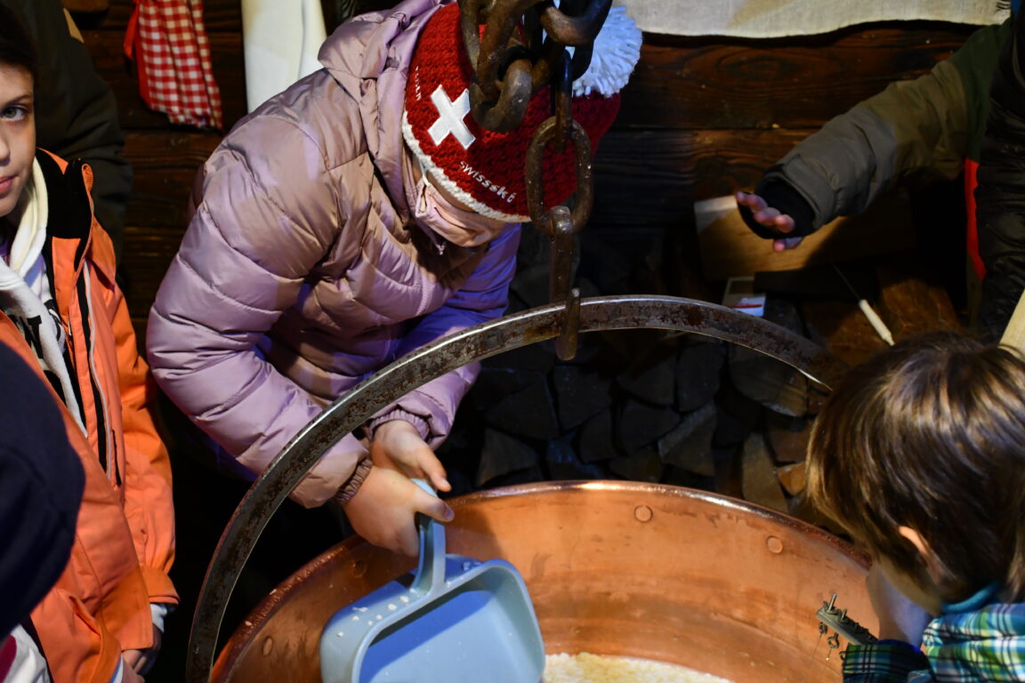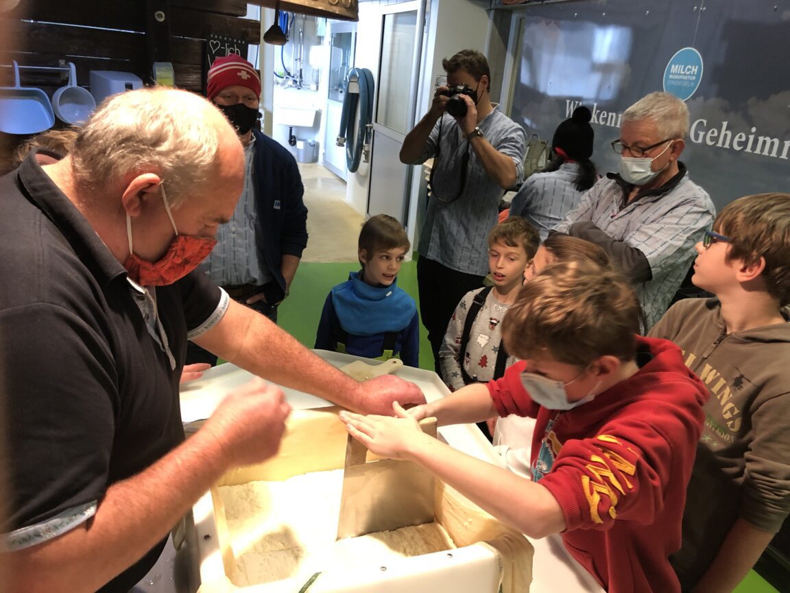 Unser 3. typisCH-Tag führte uns am Morgen zur Milchmanufaktur Einsiedeln. Unter fachkundiger Anleitung stellen die Kinder ein Sennenmutschli-Käse her. Der Käse-Herstellungs-Vorgang wurde vorab im Unterricht behandelt, so konnten sich die Kinder ganz auf’s praktische Handwerk «käsen» konzentrieren. Im Januar wird sich herausstellen, ob aus dem selber gemachten Käse ein genussvoller Happen geworden ist – wir sind gespannt!